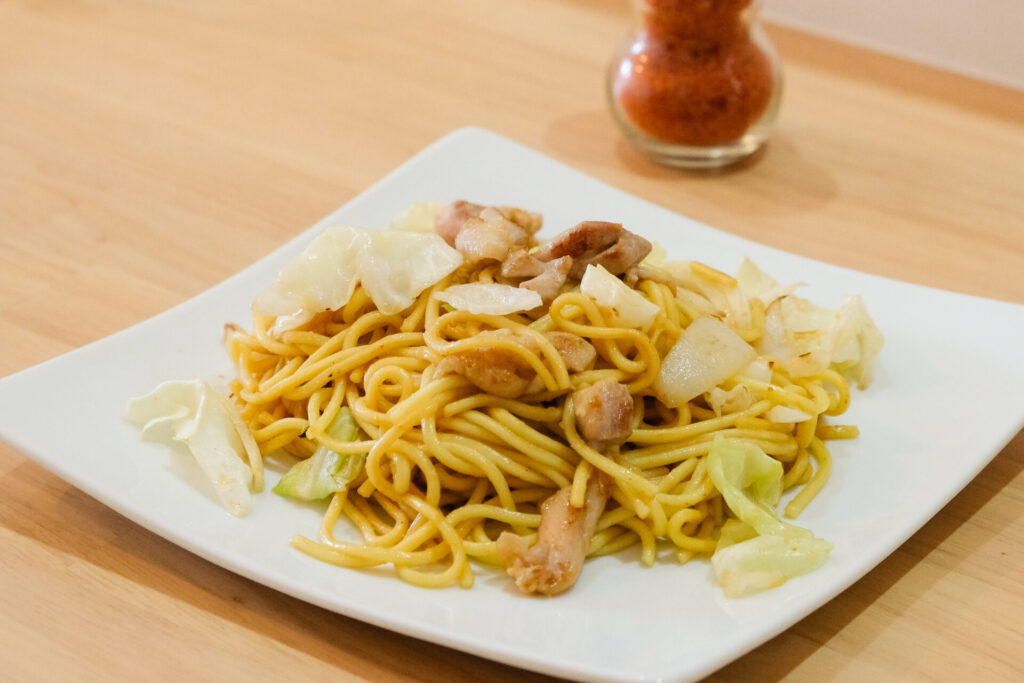 中太麺でもちもちの麺を使用したひるぜんの焼きそばも絶品!特製味噌ダレと鶏肉、キャベツ、玉ねぎを使った焼きそばが特徴です。お好みで一味で味変していただくのもおススメです。