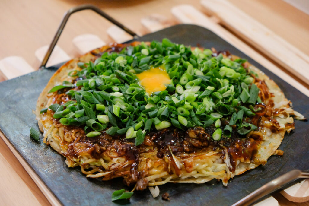 温かいお好み焼きをヘラで食べる醍醐味を味わっていただくために、個人個人に温めたミニ鉄板で提供しています。麺の焼き方はパリパリとふわふわから選べます。トッピングも数多くご用意しておりますので、お好みの食べ方でお召し上がり下さい。